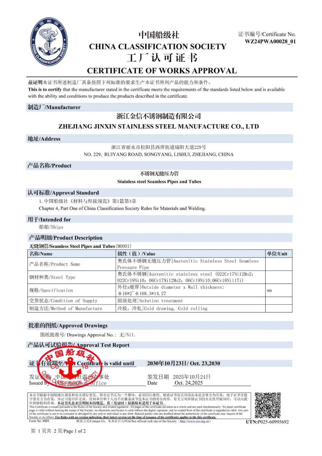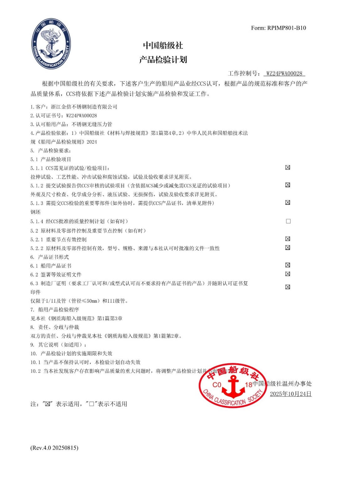 作为国内船舶检验领域的 “国家队”,CCS 认证以标准高、审核严著称,是企业叩开海事市场的 “黄金通行证”。此次认证通过,不仅是对金信不锈钢耐腐性、强度等核心性能的权威背书,更印证了其在高端不锈钢制造领域的技术硬实力。